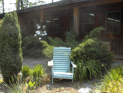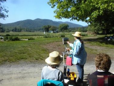 After this, we went to an area that had some little gardens and rustic buildings, so there was a good variety of subjects. I talked to Barbara about how it was good for me to loosen up and paint in broad strokes and areas since I have always gotten wrapped up in tight details. But on the other hand, I said, I am drawn to plants and leaves as subjects and want to focus on that. So she suggested a lovely white clematis because white is never white. I agreed that was a good subject but when we got there the only spots I could set up near it were in the full sun or next to a nasty smelling ashtray. So I set up on the porch across from the clematis and focused on an old wooden chair in front of it. The clematis ended up being a nice background highlight.