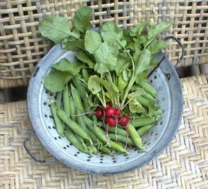 Today’s harvest is radishes and peas. And spinach, but I ate that before I took this picture! I love to eat these peas raw. I don’t grow enough to have for a whole pot, just enough in waves so that I can have snacks in the garden as I work. Why did I ever cook peas, I wonder?