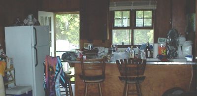 the counter where we eat. The cabinets, like all the walls in the place, are constructed of unpainted dark knotty plywood, and the doors do not care to stay closed, occasionally giving an under-vigilant drunk a bonk on the head. Many of the dishes and much of the