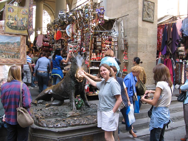 One of the first places we wandered into was the Mercato Nuovo, one of several street markets in Firenze that mostly sells leather, scarves, and souvenirs. It was originally a silk and straw market, and is covered (a loggia). Rick Steves noted that there is a “circled X in the center [of the ceiling], marking the spot where people hit after being hoisted up to the top and dropped as punishment for bankruptcy.” I didn’t see that, but I did rub the snout of Porcellino, a bronze statue that tourists rub in order to ensure that they return to Florence one day. This was the only time that I saw it when it was not mobbed with tourists.