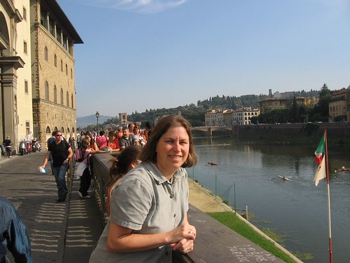 We continued down to the Arno River, then we found ourselves right smack in the middle of one of Firenze’s hotspots – Ponte Vecchio, the Piazza dell Signoria, and the Uffizi. There are many statues here, including a copy of David. The original David was moved to the Accademia to protect it. We walked through the Uffizi courtyard, where there are street artists and living statues, as well as the ubiquitous sunglasses and handbag knock-off street sellers, displaying their wares on sheets and cardboard that can be quickly scooped up when the authorities come around.