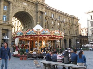 I was getting cranky from pain and hunger (I had problems with what is probably a heel spur during this trip) and this was a nice place to people-watch, so we decided to try getting a bite to eat at one of the outdoor restaurants. Nope – the kitchen was closed because it was mid-afternoon. I felt overwhelmed and so we headed back closer to the hotel and found a place to eat in the Piazza dell Repubblica near this carousel. This was, in retrospect, a dumb decision. They were clearly recruiting exhausted, naive tourists.