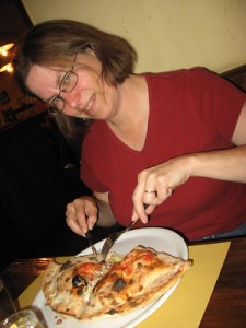 We crashed at the hotel despite our best intentions, then got up at 9 p.m. and went to the Osteria dell Agnolo, just around the corner, for Birre Moretti (beer) and calzoni capriccosi (calzone with ham, olives, artichokes, and mushrooms) and finally I felt relaxed. We enjoyed this place – we needed a spot that was casual so that we could kick back. I tried out a little Italian on the busy waiter and he put up with me! By this time, I had consulted my
