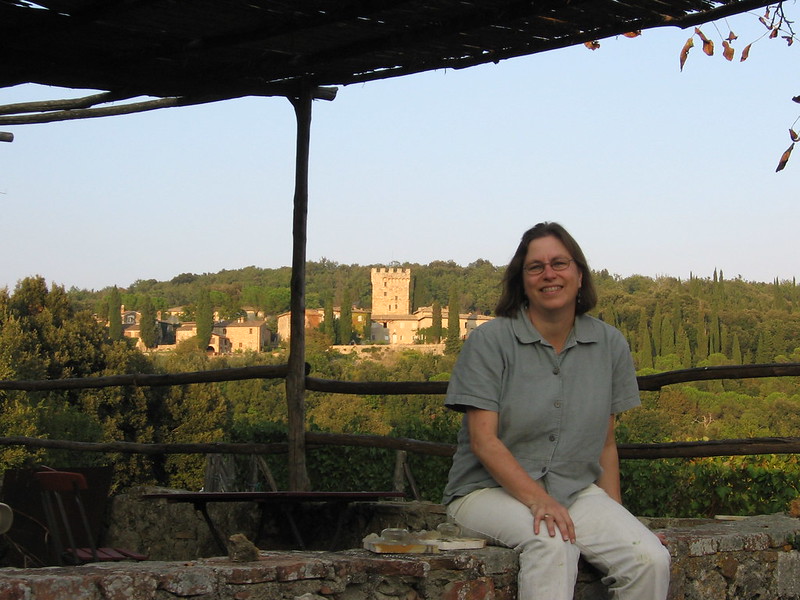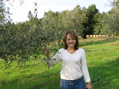 We first veered off the road into one of the olive orchards, which had a line of beehives at the back. Unfortunately, the olives weren’t quite ready for harvest, but Charlie fooled a couple of people into tasting them. Spannocchia did not have any olive oil for sale, but it uses the oil that it produces and supplements it with oil from other farms in the area. Teresa (right) did her project on olive and oil production.