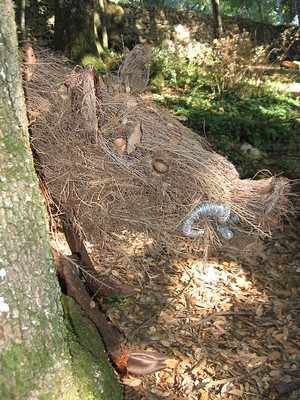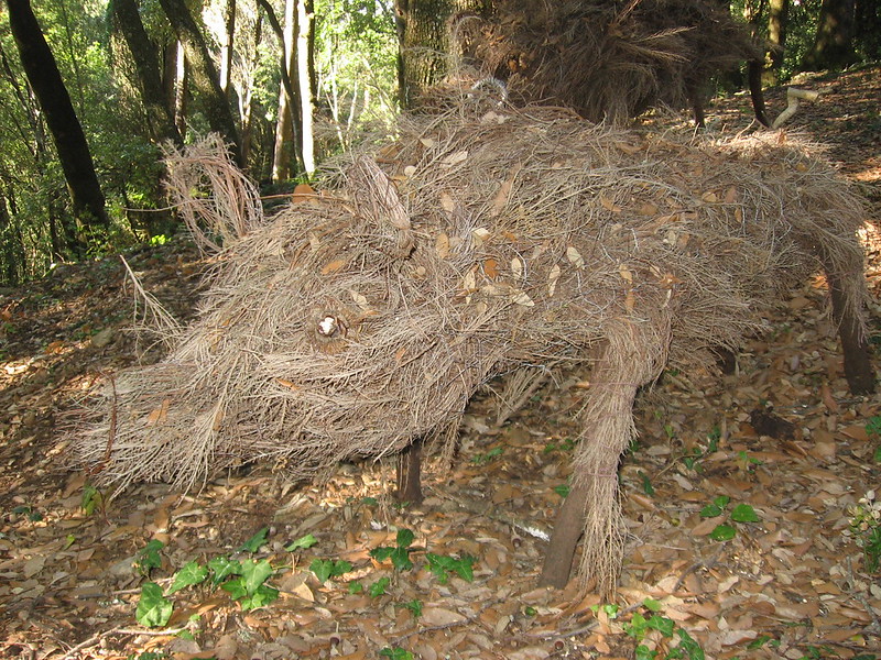 After that incredible lunch, we had a little bit of time to relax. Sandino played chess with Charlie, and I spent some quiet time in il giardino segreto (the secret garden) with a book, my notebook, and camera. I didn’t go far, since I was trying to heal my foot before our big road trip to Poggio Antico andSan Gimignano the next day. But I found some interesting fiber sculptures just off the trail.