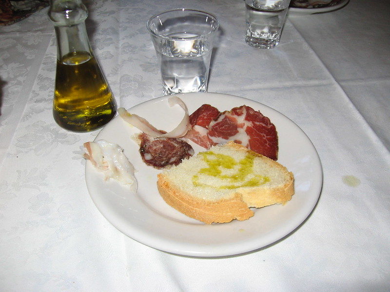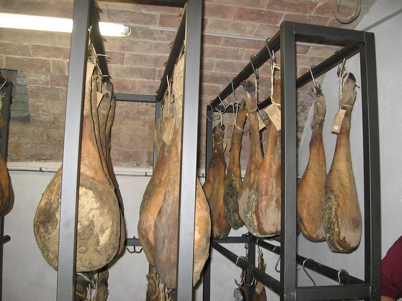 The tour concluded with a visit to a basement storage room where prosciutto hangs to cure, and a tasting of the different items that are produced from the farm’s pork. I heartily support and applaud small livestock farmers who produce their own meat with love and care, but I have a hard time meeting the animals that I eat. Plus I just recently began eating pork again after years of not eating it for a variety of reasons. Even though we didn’t meet the specific animals that we ate, it was psychologically difficult. But I tried all of it, and enjoyed the salume the most. We ate these again on pizza night and on Friday, when we had lunch outside in the courtyard.