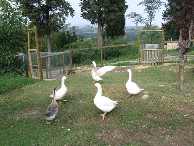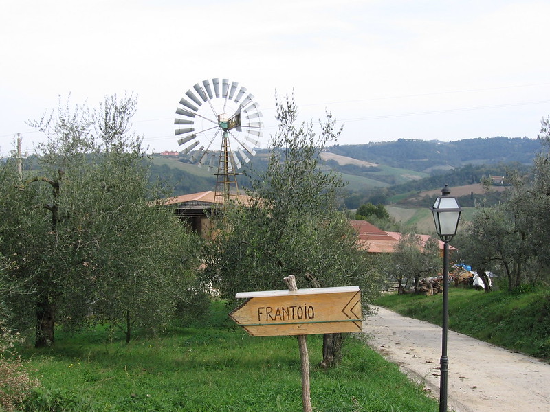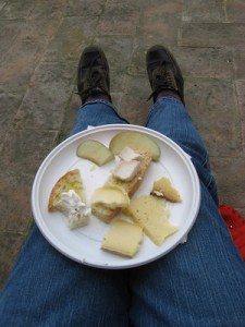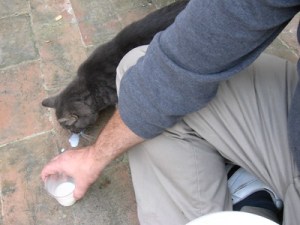 Roberto told us about the process of growing, harvesting, and pressing the olives into oil in their modern frantoio (olive mill). Afterwards, we went into the farm’s store and bought olive oil, pasta, and other products to take back with us. Charlie and Debby bought a variety of cheeses for our picnic, which we tasted along with fresh fruit and salad. A big treat for Sandy and me was a bottle of raw milk that we shared, with just a little for one of the farm cats. Sandy was bowled over by the freshness and taste and so was I.