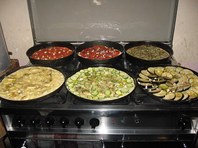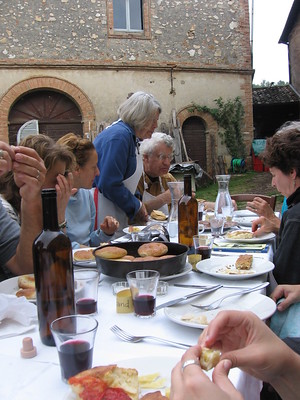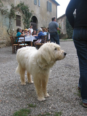 The weather lifted for long enough that we were able to set up tables out in the courtyard and have lunch as the different dishes came out of the brick oven. Staff members and family from Spannocchia and Lapo the sheepdog drifted around and munched happily with us. Debby said, “Doesn’t it remind you of a Fellini movie?”