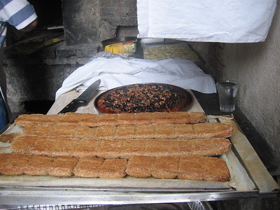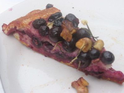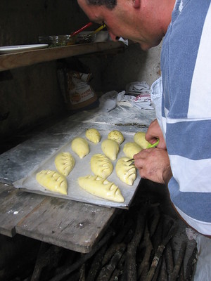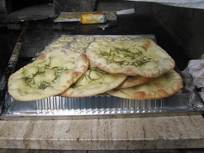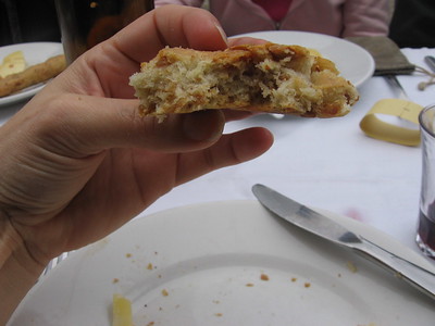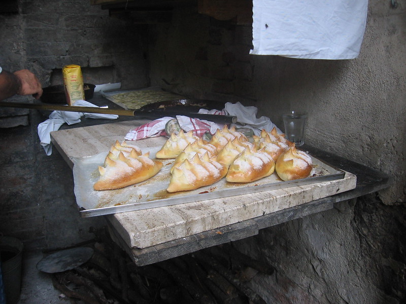 He turned out an incredible amount of baked goods in just a few hours, including sciachata con uva, a grape tart with rosemary and walnuts, several different focaccie and pizzettine, and a peasant bread that was filled with “all the leftover parts of the pig.” This sounded awful, but it was delicious, just as he said it would be. He snipped some rolls with scissors to raise a spiked crown on top, and sprinkled sugar into the spaces. We had these for breakfast the next two days.