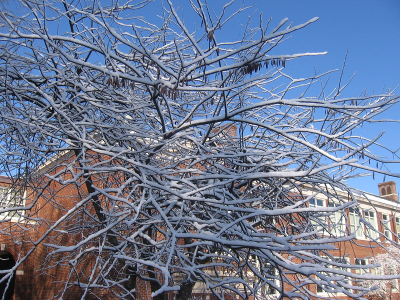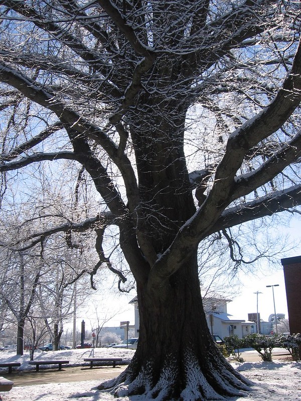 I think that this tree is a redbud. The snow was piled as high as the horizontal branches were thick.