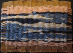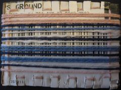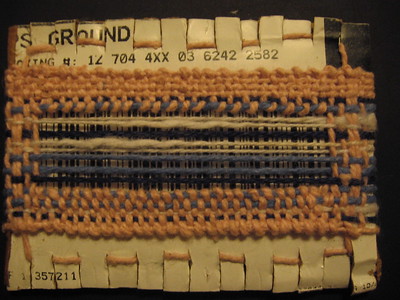 I couldn’t find the shade of brown, and it irked me because I felt that it was so familiar that I must have it somewhere. I stopped and took a few moments to straighten up my studio, and there it was – my cardboard box that I used as a loom for the tapestry bag. I decided to incorporate a small cardboard loom into my project for the brown color, and I cut the box into small pieces. One piece had the UPS shipping sticker on it, and I thought, I remember when there wasn’t a bar code or number on every single thing that was sold or shipped, and you didn’t have a different password or ID number for every different purpose, and the technology that is supposed to make our lives more efficient has complicated our lives in many ways.