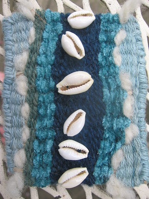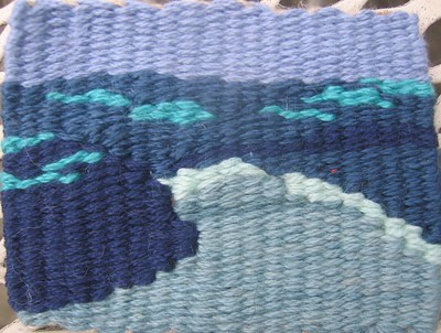 “By the Sea: Wave”; series of tapestry artist trading cards. Woven on cardboard loom. Linen warp, cotton weft. 3.5 x 2.5 inches.