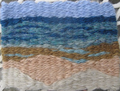 “By the Sea: Tidal Pools”; series of tapestry artist trading cards, woven for trading at Art & Soul in early May. I drew on memories of Sunset Beach and Tubbs Inlet for these seascapes. Woven on cardboard loom. Linen warp, wool weft. 3.5 x 2.5 inches.