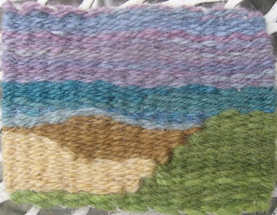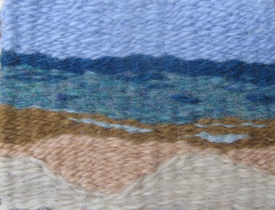 ^“By the Sea: Overcast Low Tide” – I think that we’ll keep this one, as it is too big for an ATC and I’m rather fond of it. The wool for the sky was space dyed leftovers from a weaving years ago. Linen warp, wool weft. 3.75 x 2.75 inches.