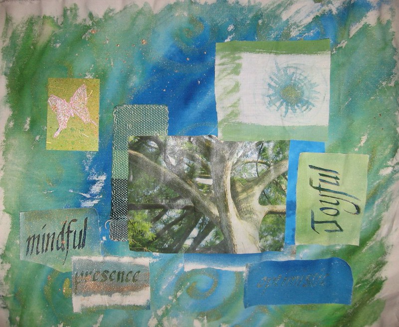 The latest progress on “mindful presence” – this was started in Lisa Engelbreicht’s Fabric Art Collage class at Art and Soul at Hampton. I liked the right angles and the balance, but something about it still bothered me. So I began clipping corners, and then I decided to start swapping corners. I like the result a lot! I have this tacked onto a frame for quilting, but I now realize that these layers of canvas are going to be painful to quilt. So I’m going to glue on the rest of the elements and do a little beading, and it will be done!