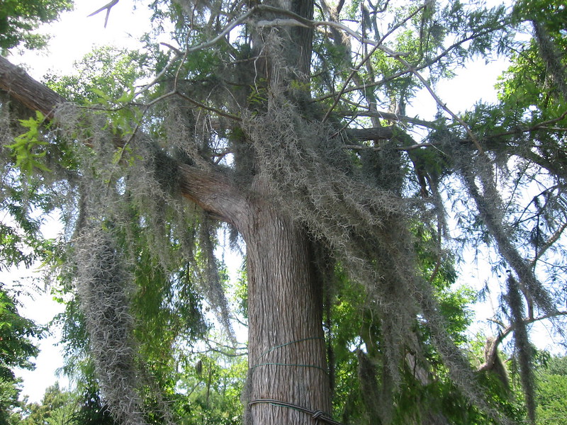 The lake changes every time we come here. Last year during the drought, the artisian well dried up and the water receded about 8-10 feet. This brought differences in the water plants, as well. Then in late April, the water was lapping at the edge of the bald cypresses, higher than normal. Now, in late June, the old cypress stumps that were formerly buried in the sand were exposed much more than normal, and were catching lots of flotsam and jetsam from the lake, including a lot of broken glass, china, and brick pieces. I even found a broken flower-arranging “frog” in the lake. I spent time everyday wading on the edge of the lake, picking up glass and trash and hard driftwood sticks. I plan to use the driftwood in making books and paper sculpture and weaving – I’ve got several ideas for these sticks. I think that my most pleasurable activity was wading under the shade of the huge old bald cypresses, picking up the small smooth sticks and knots of wood.