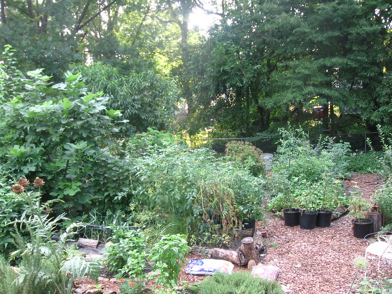 All the pole beans and big tomatoes are making the Back Forty look like a jungle this year. There’s a solid L-shaped wall of vines right through the middle of the left side, attached to the fig tree. The fig tree is beginning to alarm me because of its huge growth spurt in the last few months. It’s easily doubled its size this year.