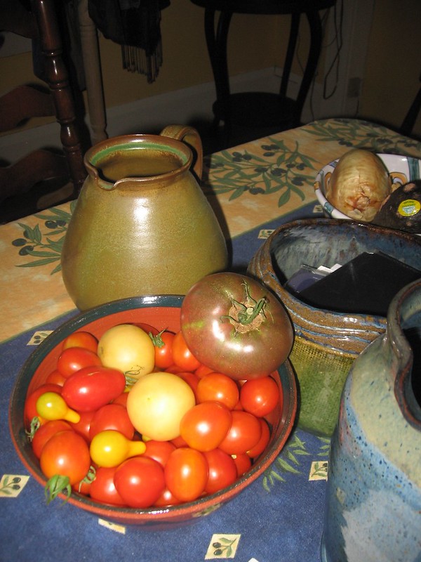 I’ll put yesterday’s chicken in the crockpot with some potatoes and carrots and dried porcini mushrooms, with garlic and rosemary and basil and lemon thyme. I’ll load the food dehydrator with slices of peaches and Principe Borghese tomatoes, probably not all today, probably not in that order. The tomatoes are prolific and the seedlings were the most robust of all my tomato seedlings, resisting the aphid attack and pooh-poohing the early dry period in June. But :::sigh::: they really don’t taste very good. This variety was recommended for drying, which is why I bought the seed, but maybe it’s because they don’t taste good fresh or canned? Anyway, next year I’ll go with Juliet again, which is good eating and drying.