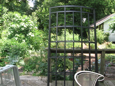 In permaculture, a bed shaped in a U with the opening to the south is called a keyhole bed. The purpose is efficient use of the soil as well as capturing the southern heat and light. This spot is where I put my greenhouse in winter months. I make flat cages out of wire fencing to go over my beds after I plant to protect them from digging animals. Sometimes I leave them there and let the plants grow up through them.