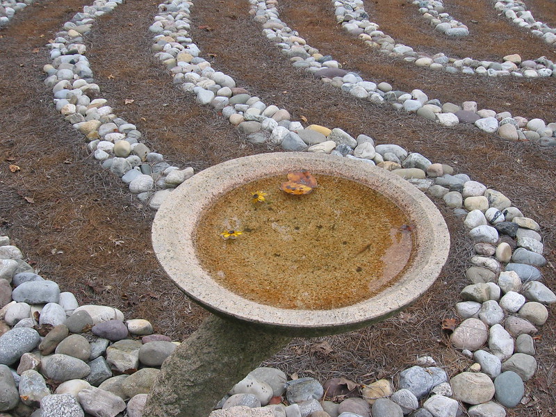 I finished the labyrinth tapestry several weeks ago, and forgot that I had not posted it. I don’t have a camera right now but I do have a scanner. The first photo is the tapestry and the second is the photograph of the labyrinth at Healing Ground in Oak Ridge that inspired the tapestry.