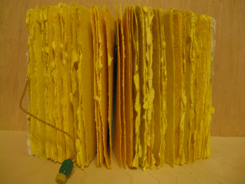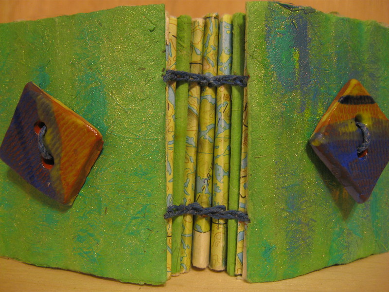 Okay, one more. I made the paper for this simple book from recycled paper and included sunflower petals in the cover. Added a button and bead for the closure. The binding is Coptic, and the painted spine covers are my artichoke paper.