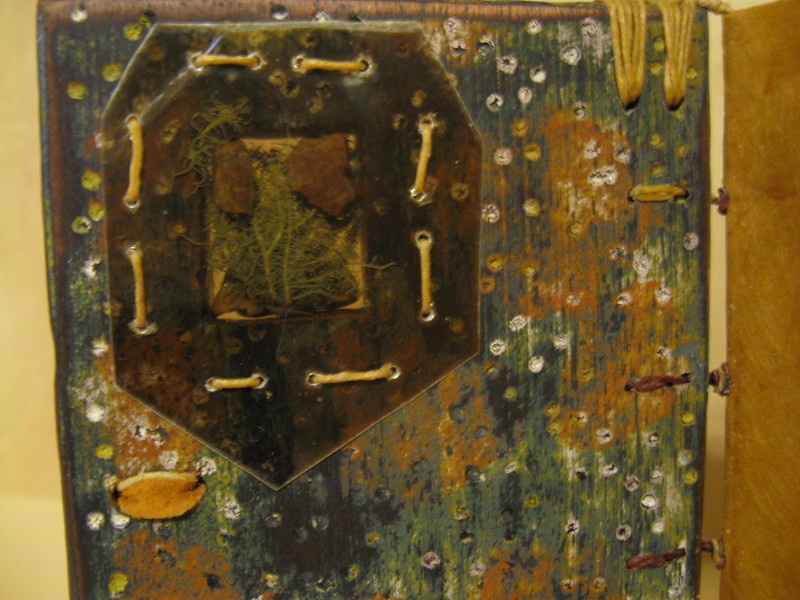 The first two are of the Brasstown book with wooden covers that I made at John C. Campbell Folk School in October. The mica window encloses lichen and pebbles from John C. Campbell Folk School. The bone clasp was soaked in black walnut “juice” to tint it.
