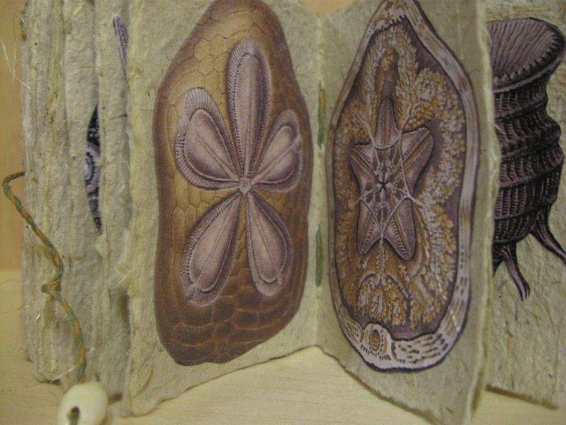 Here’s the one I’m excited about. The cover is one of the tapestry ATCs I wove last spring. I’ve become entranced with the illustrations of Ernst Haeckel, a German artist and evolutionist who lived in the late 19th to early 20th century, so I cut out some of his work from 1899 and pasted it into the book. Paper is my handmade artichoke paper, natural and painted with acrylic washes. Coptic stitch.