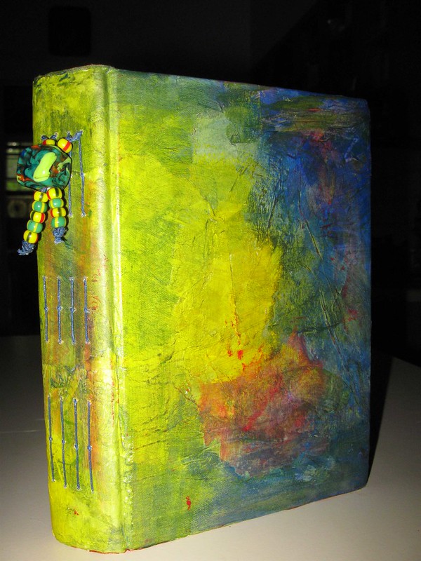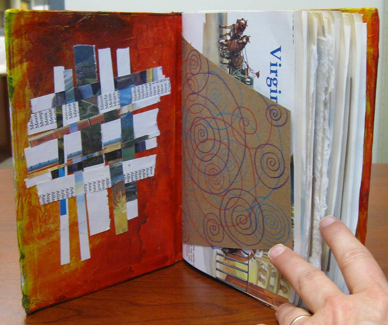 Made in Traci Bunkers’ “Revival: Restoration to a Visual Life; An Awakening” class at Art & Soul, Hampton, Virginia, May 3, 2009. This recycled book cover is filled with all kinds of groovy papers and stuff, including a pamphlet from the 1956 Pennsylvania Dutch Festival in Pottstown, PA, music from a 1923 gospel book, and a kid’s atlas. I love this book. I want to cuddle up and sleep with it.
