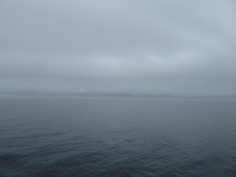 Right now I can only see water and smooth waves. I want to see more! but the motion of the ship is relaxing. The sky is melded to the sea by fog. It is in the fifties and there is a pleasant cool breeze.