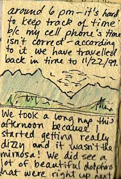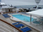 Someone spotted a whale this morning but we missed it. We saw a couple of dolphins. Sandy decided to go back to the room to sleep some more and here I am on the aft top deck with a wool sweater on, taking the opportunity for journaling in solitude.