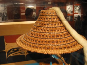 Tuesday, 7-14-09 Ketchikan, Alaska: had a long morning on our feet in Ketchikan, which we chose to explore on our own. LOTS of tourist shops. A few good art shops. The 1st one we visited was near the ship & away from downtown. Elsie [Gale] (says that website will be up shortly) is a Haida weaver and she weaves on a “gravity” loom in which the warp hangs loose from a top bar and she controls the tension with her weaving. It looks very difficult. The spruce root and cedar basketry is stunning and I wished so much to buy a Haida woven hat but they cost hundreds of dollars.