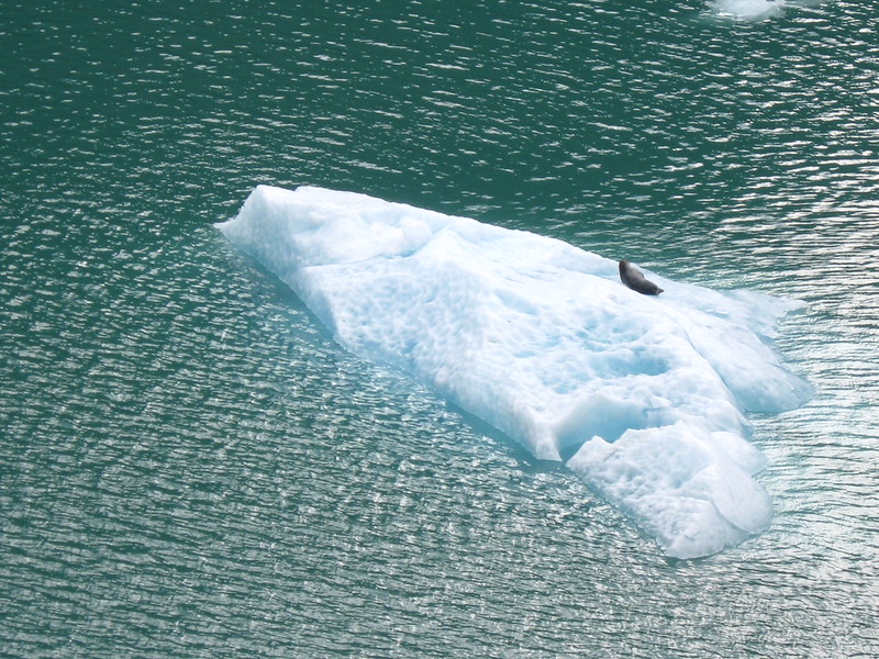 [Harbor seals rest on icebergs where they don’t have to worry about being eaten by orcas.]