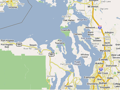 In case you didn’t get the news, this is where I’m heading at 6:30 a.m. I should be there at 4 p.m. their time. I’ll be in the little green area just above the words Port Townsend. Seattle and Tacoma are just to the south of the map.