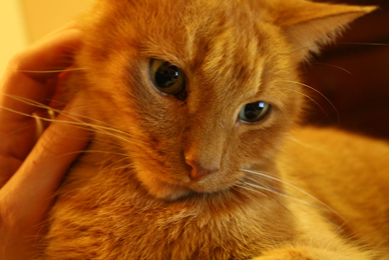 Theo is now in my lap. He is a sweetheart, but he is a normal cat too. I’ve accused him of faking the angelic personality to infiltrate our home only to release his inner demons after settling in. Among his sins: stalking and attacking Sir Guido, sticking his butt in our faces when we sleep, scratching the furniture, and pawing at the mini-blinds behind the bed to wake us up when he wants something. Actually, these things don’t happen every day, but I just thought I’d let everyone know that he ain’t no saint. He does play and cuddle with Lucy, and all the cats are as relaxed around him as they are with each other, which doesn’t mean that they are good buddies, but they aren’t hostile either. He is a real pleasure, other than the occasional sins, which we are training him out of, hopefully. He wasn’t all over me constantly yesterday, so I take that as a good sign that he now feels at home.