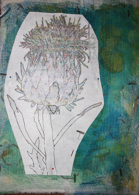 I think that I’ll have my own art retreat day right here. I’ll polish off the leftovers from this week for meals, and let the cooking and housecleaning go. Play my new Lyle Lovett CD, listen to podcasts, This American Life, and Anne of Avonlea. Take a long hot bath and inhale some steam. During and in between, I’ll be stitching and painting and maybe bookbinding. I started this project this morning. I’ll be playing with this one, really trying to let myself go wild. The first step is to stitch the outline of the cardoon flower over these layers of painted fabric and cheesecloth, then I’ll tear this water-soluable paper away and add fabric pieces, stitching, and beads.