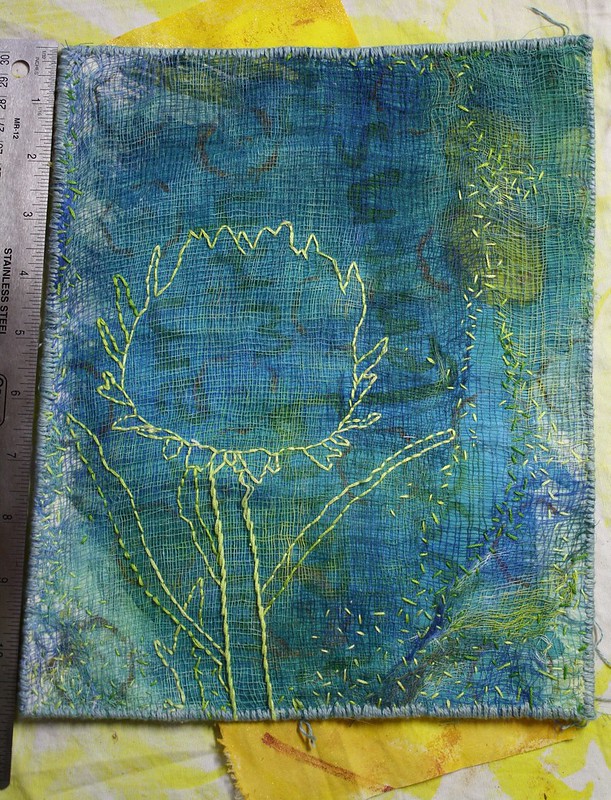 Step 2 – stitched the outline of the design, stitched the layers down with random stitches, and whipped stitch around the edges.