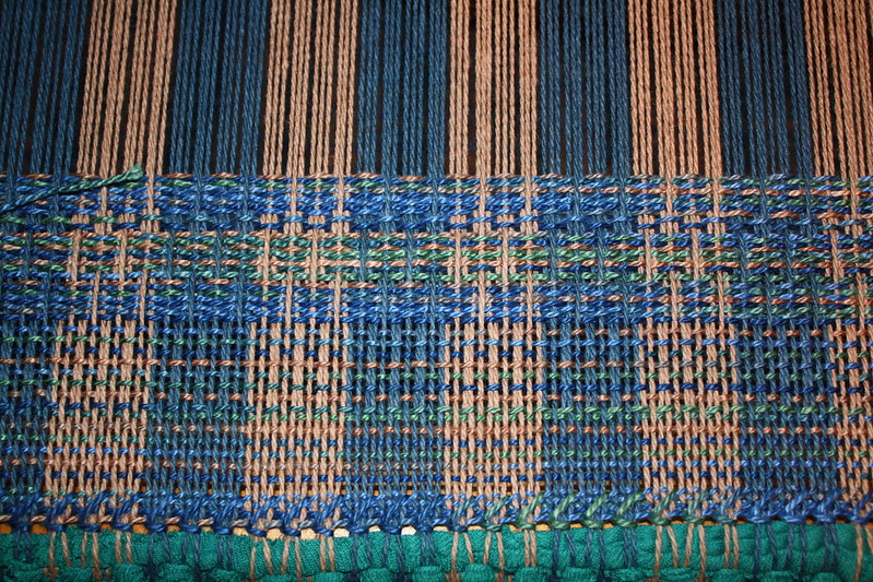 I wove all week long and washed and dried the fabric last night. The texture and color is fabulous! I have a towel/breadcloth, a long table runner, and a little sampler (shown below on the loom) that I think will become a book cover. Today I started measuring off another long striped warp for the Baby Wolf 4 harness loom, this time more random with stripes based on the Fibonacci sequence. If I get into the gallery, I plan to take my small 8 harness loom there, so I’ll need to design something for it.