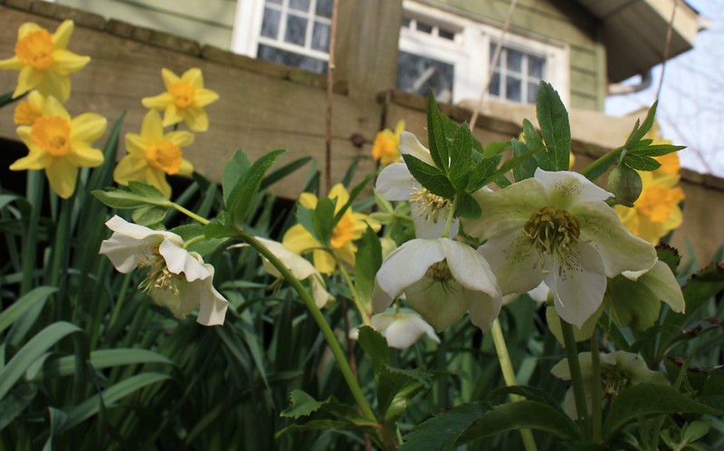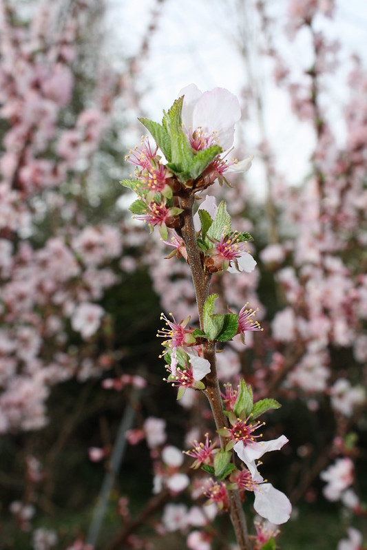 I used colors in this striped warp design that I saw out the studio door and window: the red Nanking cherry tree in blossom, the bare trees just beginning to leaf out, the violets, and the blue jay flying past every few minutes. The stripe design was fairly random, using the Fibonacci sequence of numbers for balance, but I balanced it further by adding a symmetrical design of larger stripes in between the randomness. I’ll post a photo if I ever get the damned thing warped so you’ll see what I mean.
