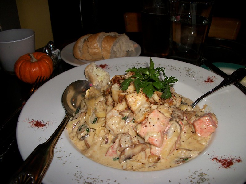 On Friday afternoon after class, I walked a mile up a steep hill and back down into downtown Port Townsend for dinner. I had company. The deer in Port Townsend are like squirrels here – everywhere and quite used to people. Unfortunately, most of the town there rolls up the sidewalks at 6 p.m. so I wasn’t able to explore the galleries. I did get to eat a delectable, decadent seafood/wild mushroom pasta at the Fountain Cafe.