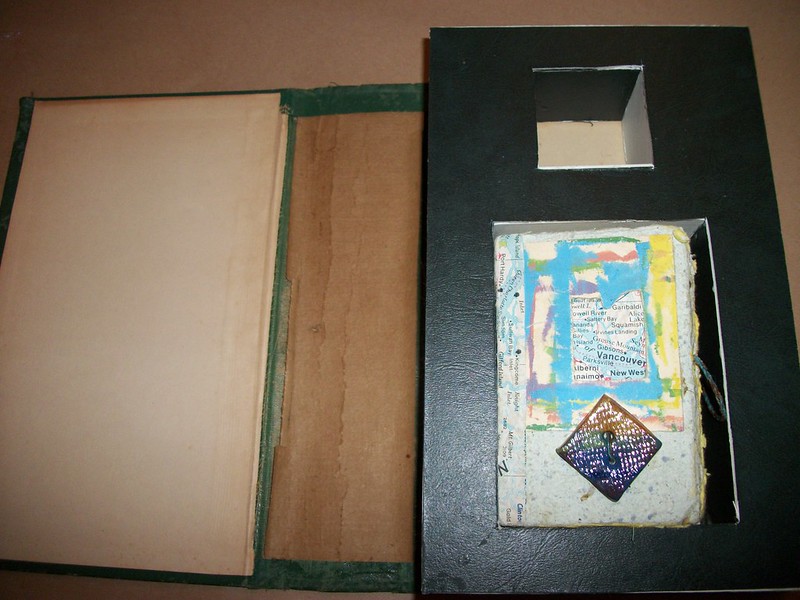 I’ve been saving this book to use for my Alaska journal – I made rather a mess with another one its size on my own, trying to make niches in the text block. Jodi used it for a demo and promptly removed the text block, saying that it was perfect for a box. It turns out she was exactly right, and I now have a great structure to contain my Alaska travel journal and some stones and other natural items that I picked up on the trip. I’ll take another photo when I’m done collaging and painting it.