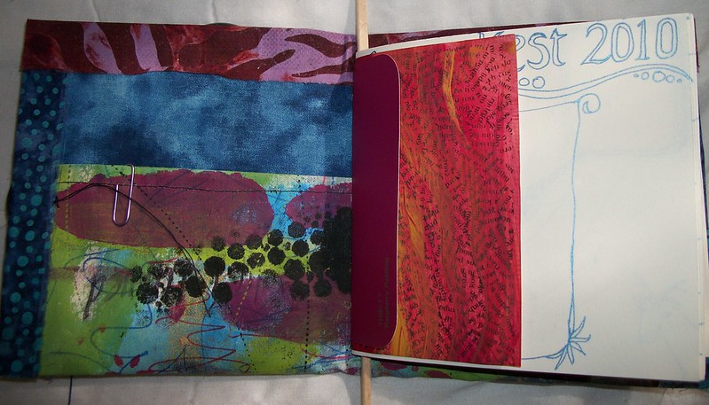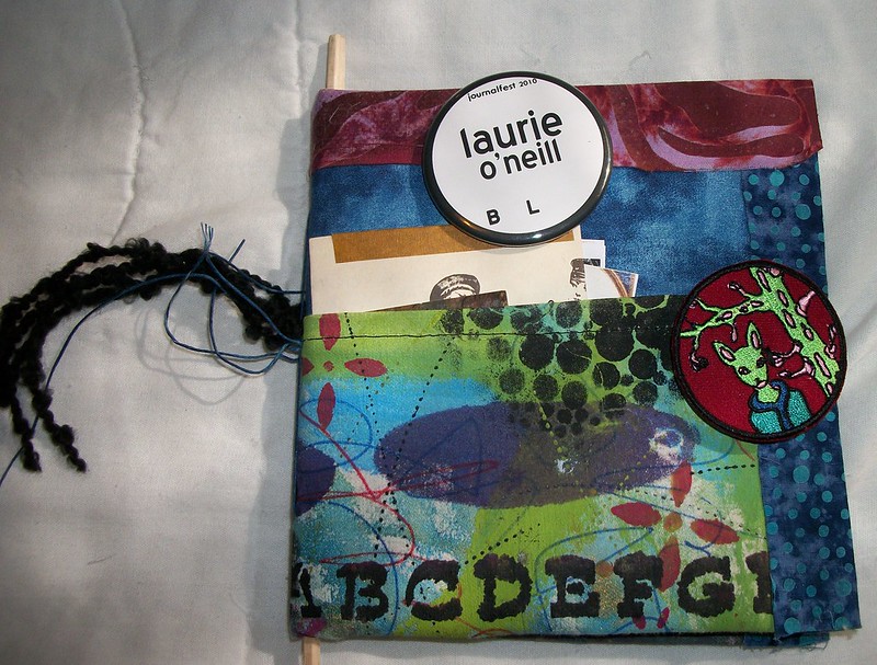 The first day I took Painted Pocket Journals with Roxanne Padgett. This is taking me in more of the direction that I’m interested in exploring – fabric/fibers combined with book arts. We painted and stenciled fabric with gesso and acrylic paints, then stitched and fused them together to make folded covers for books. Pure play for me, and I loved it so much that I forgot to take photos. Sorry! But I did take a photo of the journal that I made for Journalfest in this class. I will be filling it with my thoughts, photos, and drawings of Journalfest. I have many ideas for this as far as little cloth journals for sale on Etsy and at the Indie Market.