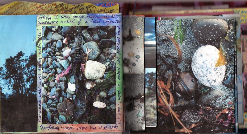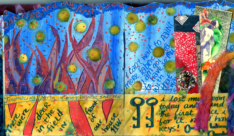 The pages are different sizes and shapes. Sometimes I added business cards to the edges and folded the edge of the page over. Sometimes I glued stuff in. I used two-sided tape. I made pockets for treasures. I cut pages into shapes that suited me. If I messed up, I colored or collaged over my mistakes, or I left them there. It’s my journal. I make mistakes and I’m cool with that.