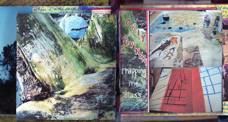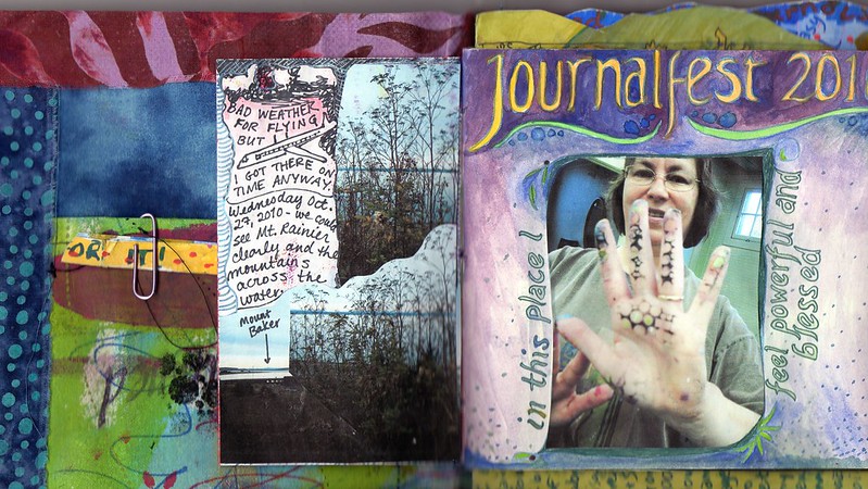 I did some of the pages at Journalfest and added them in later. Since I didn’t realize I would decide to use this particular journal, they had to be cut down to fit. And I didn’t want to cut down the pages I made in Orly Avineri’s class, so they are not included, but I included photos of them in the making.