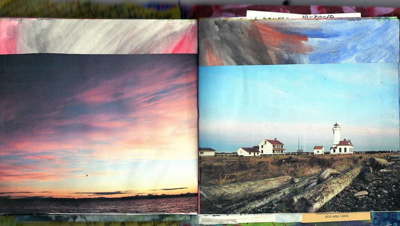 I finally finished my Journalfest journal yesterday while waiting at the doctor’s office. I’m posting some of the pages here in case you think that art journaling is hard or requires special talent or something like that. An art journal is just for you, and it contains a combination of art and writing, or maybe just art that reflects where you’re at or what you’re feeling that day. I mostly use photography in my art journals. I played with a cheap little mini watercolor set with this one too. Some of the pages were not scanned because they contained some personal thoughts or weren’t very legible.