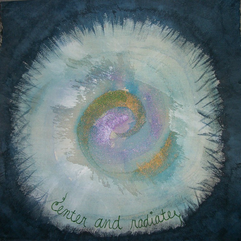 Here’s the prayer flag. I went in an entirely different direction than my original plan after I found a piece of fabric that I painted a couple of years ago in a workshop. I’ve been thinking a lot about how real change only comes from within each of us. I painted the universe around it and wrote the words, and I’m done. I wanted to bead or sew French knots, but I am going to mail it today just the way it is to stop myself from stitching!