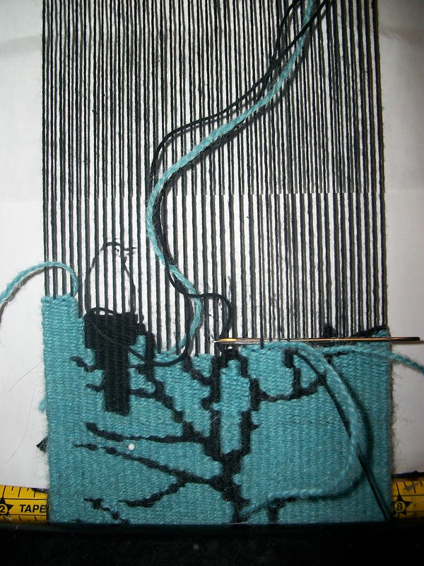 Finally, here’s the latest progress on the bird tapestry. There is only a couple of inches to go. The rest of the tapestry has been pulled around to the back of the loom, so I’ll have plenty of warp to do another tapestry on here when this is done.