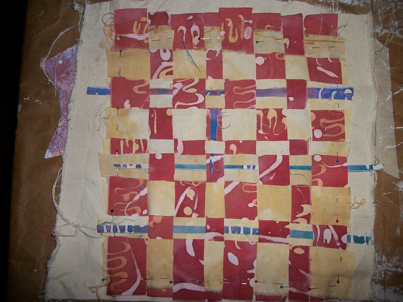 I started playing with the woven fabric strips, inspired by Jude Hill’s work. My soy wax batiks from Melly’s class provided a lot of inspiration yesterday. I started fusing together book covers from them, but photos will be later when they are a little more complete. Here is the beginning of the woven piece, with which I may take completely apart and experiment more. I love, love, love this idea and can’t wait to be able to stitch on it. I have some lovely worn hole-ridden nuggets of shells that are just aching for a background to show off.
