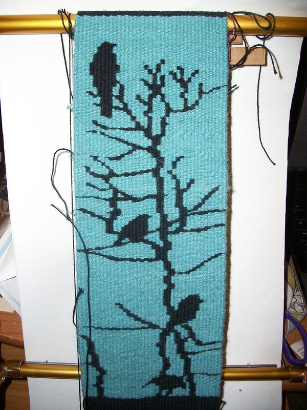 Here’s a photo of the finished bird tapestry still on the loom, and the beginning of the sunrise tapestry. I’m not working from a cartoon with the sunrise tapestry, just referring to the photograph from time to time.