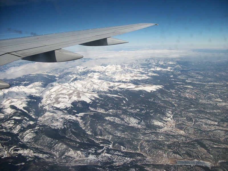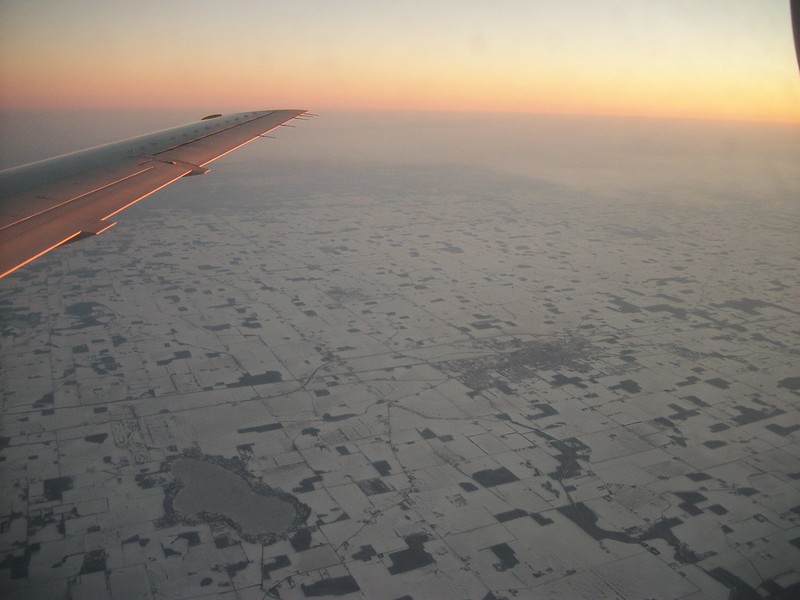 I flew through unusually warm weather over the United States, but Illinois was still covered in snow. Although the flight from Chicago to Denver was packed, I got lucky on the other two flights and had two and three seats to myself, allowing me to catch a little sleep. I looked out the window a lot this time, something I don’t usually do because of a tendency for motion sickness. The terrain fascinated me. I didn’t take photos of the farmland much, although I loved the patterns of squares and circles and textures. However, the farmland in central California was disturbing. It appeared so humanly constructed. There were hardly any trees and each stream seemed to be carved by human hand into the landscape. I may try to photograph it on the way back.