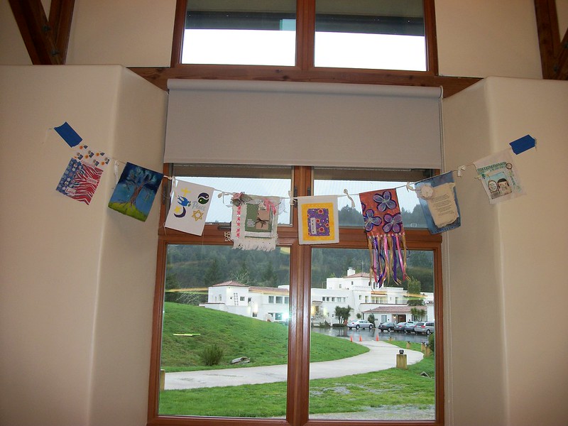 Prayer flags sent in by the Artful Journey attendees hanging in the dining hall. The Pueblo building where I am staying and taking my class is in the background.